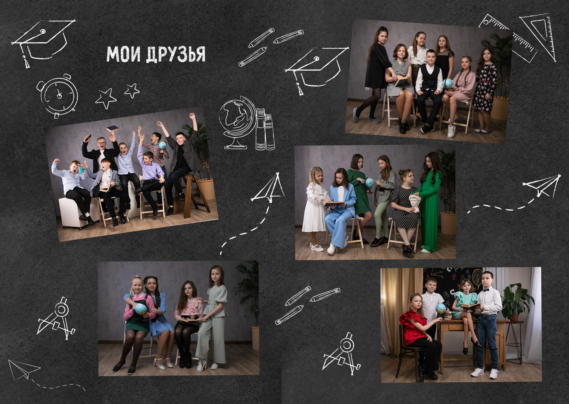 Мы располагаем фотостудией с различными школьными фонами.